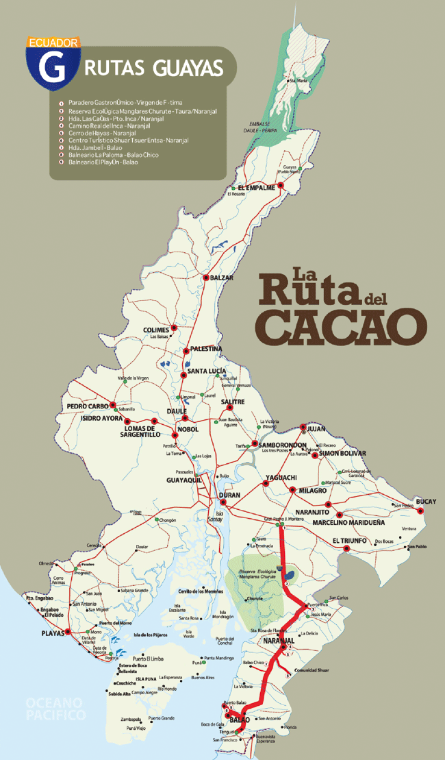 En Guayas, la provincia cuya capital es la primera ciudad de Ecuador: Guayaquil, se han abierto diferentes rutas relacionadas con productos agrícolas, como el arroz o el azúcar, y una de ellas es la "Ruta del Cacao"La ruta se relaciona con el mundo del cacao, de hecho, la mayoría de las atracciones turísticas de la ruta del cacao no lo son.